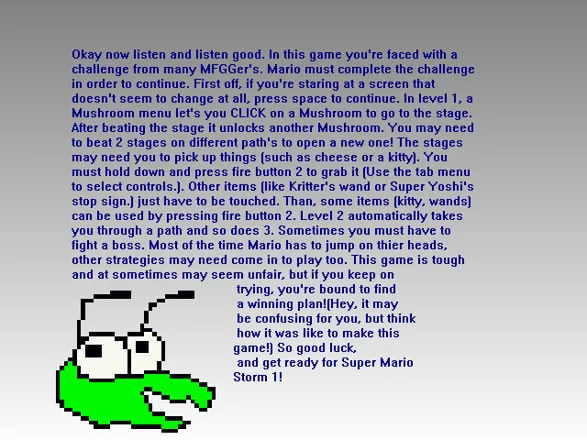 Super Mario Storm is a comedic Mario fangame that primarily centers on the early 2000s Mario fangame community, featuring many references and in-jokes relating to that scene.