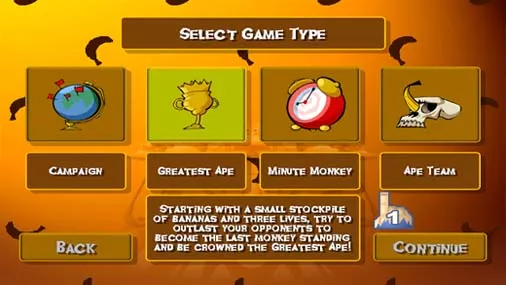 All the monkeys will be positioned on small podiums each separated from their neighbours. Use your skills in banana flinging to knock the other players off their podiums, which will result in them losing a life. In some game modes there are crates separating each monkey which can be broken to access power-ups and ammunition, or to simply open up a clear path to launch an attack on your opponents.
