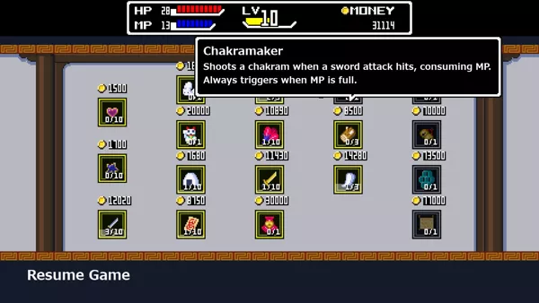 Some can be bought at a shop, others are obtained by defeating bosses, and a few are in hidden areas.