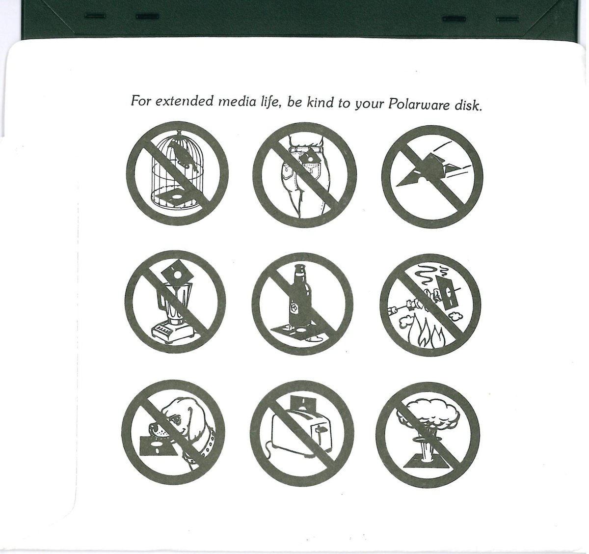 On the reverse side of the disk sleeve of the Apple II Polarware release are humorous disk care warning icons that indicate how a floppy disk should not be handled. These are perhaps inspired by Beagle Bros as the toaster and folded plane warnings depict the same ideas.